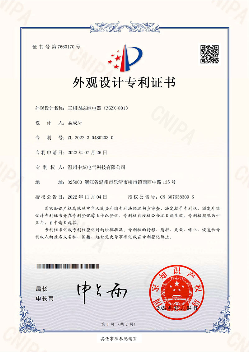 三相固態(tài)繼電器(ZGZX-801)-外觀設(shè)計專利證書